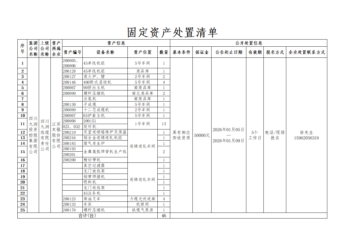 江苏东强股份有限公司诚邀投标人参与我司固定资产处置现场招标,为使招标过程公平、公正、公开,现将相关事项通知如下,如投标人报名参与此次招标,则视为同意本文件中的相关条款。